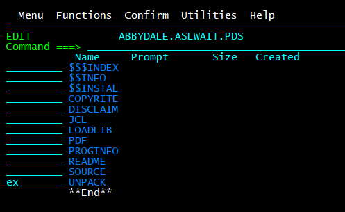 Run the UNPACK member of the Received DatasetThe UNPACK member of the received dataset will extract the required datasets that comprise the program. Follow the prompts issued by the UNPACK member and all the required datasets and a PDF dataset (if available) will be allocated and populated with all of the required components. To execute the UNPACK member either put an EX next to the member i.e.